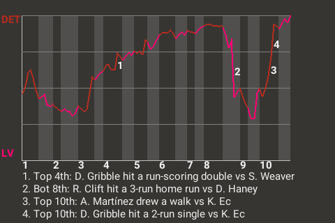 The game was all tied up in the top of the tenth, until Gribble delivered big-time for Detroit, stroking a dramatic 2-run single off Kun Ec. The game-changing hit put the Rock City on top, 6-4.