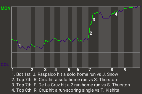 Cruz had a game-changing home run in the top of the seventh. On a 0-1 changeup from Sloppy Thurston, he banged a solo home run to left, giving the Pandas a 2-1 lead. It was the 1st home run of the year for Cruz.