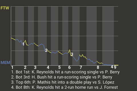 Kelvin Reynolds hit an RBI single in the 1st, singled in the 3rd, singled in the 5th, doubled in the 7th and hit a two-run home run off Jeff Forrest in the 8th.