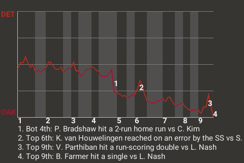 In the bottom of the fourth, Oakland center fielder Peter Bradshaw whacked a changeup to right for a 2-run home run. His 4th home run of the season put the Oaks in front, 2-0.