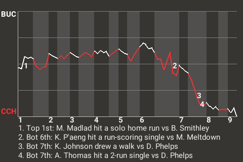 Bob Smithley was superb against Buckhead. The left-hander, the 14th overall pick in the 2056 draft, had a cutter that was virtually unhittable at times. The result was a Hurricanes victory. The score was 3-1. Pablo Jiménez earned the save, his 2nd, for the Hurricanes. Buckhead falls to 8-10.