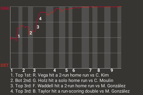 The Oakland Oaks beat the Detroit Rock City, 12-2, at Detroit Stadium. The win was due in part to left fielder Raúl Vega, who went 3 for 5 with a home run and 2 singles. He scored 2 runs and drove in 3. Oakland is now 18-10, Detroit 7-21.
