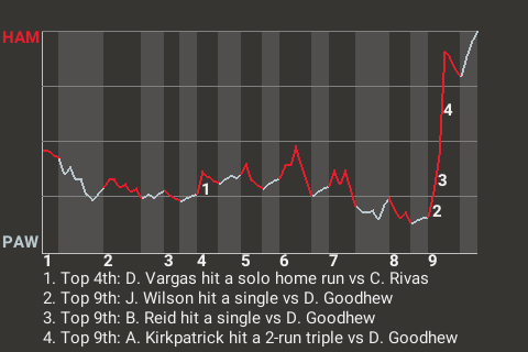 The ParksNRec got a big at-bat from designated hitter Claudio Martínez. For the game, Martínez was 1-3 with a home run and a walk. In the bottom of the fifth, with the bases empty, he stroked a solo home run. His 4th home run of the season gave Pawnee a 1-0 lead.