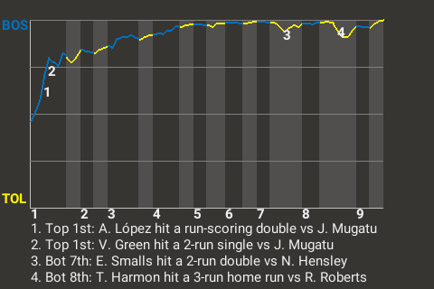 With Boston leading 1-0 in the top of the first, Green hit a 2-run single off Toledo hurler Jacobim Mugatu. It was the 36th hit of the season for Green and put his team ahead, 3-0.