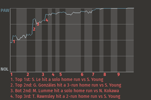 Nelson contributed a big hit, a 2-run home run, for Hamilton in the bottom of the second. With his team trailing 1-0, Nelson took a changeup from Ron Harris and stroked the home run to left. His 4th home run of the season allowed the Thunderbirds to leap in front, 2-1.