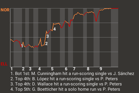 The Fighting Dachshunds got a big at-bat from first baseman Ricardo Álvarez. For the game, Álvarez was 1-3 with a home run, while adding 2 RBI and scoring once. In the bottom of the second, with a runner on 1st, he stroked a 2-run home run. His 4th home run of the season gave Ellenburg a 2-0 lead.
