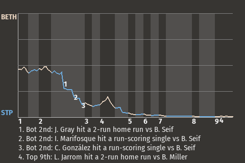 Mario Ornelas hit a 3-run home run off Jonathan Rasmussen in the bottom of the seventh, which put the Thunder ahead, 5-2. In addition to the homer, Ornelas had 1 double, while going 2 for 4.