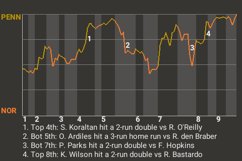 The Kansas Rainbeaus picked up a win at Wichita Field, knocking off the Montreal Machine, 5-3. Starting pitcher Jang-jin Na was a big reason why. The win belonged to Lambert Fierant in relief. His record improves to 1-1. Tynan Hunter took the loss for Montreal. This win makes it 5 in a row for Kansas.