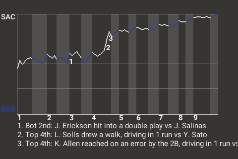 The Redlegs got a gift in the top of the fourth inning, when they were leading 2-0. With two out and the bases loaded, Kel Allen reached on an error by the 2B, driving in 1 run. It made the score 3-0, Sacramento.