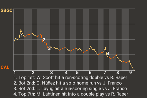 2 (4, 3rd Inning off F. Aguilar, 1 on, 2 outs; 9th Inning off W. Petersen, 0 on, 0 outs)