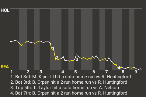 No one was more impactful than Brian Orpen in the 5-2 Seattle win over Hollywood. Orpen, who is tied for 10th in the PL in runs scored with 30, was 4 for 4 with 2 home runs and 2 singles, while adding 4 RBI and scoring twice. Alex Nelson was the winner. He's now 2-3. The loser was 26-year old right-handed pitcher Roy Huntingford. Seattle has won 3 straight, while Hollywood has lost 4 in a row.