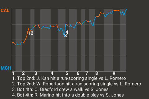 Austin took a 7-3 lead on Ortíz's 2nd double of the season. The 2-run double, which he hit off Hubert Estes in the top of the sixth, propelled Austin to the win.