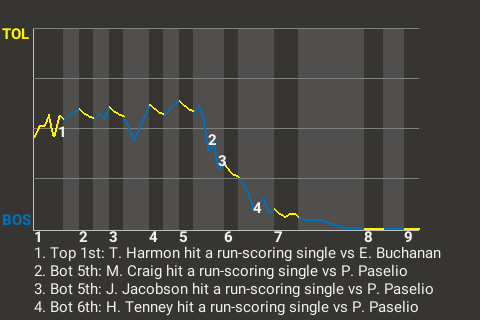 Chipping in for Boston was catcher Matt Craig. He stroked a run-scoring single in the bottom of the fifth. For the game, Craig went 3-4 with 3 singles, while adding 2 RBI and scoring once.
