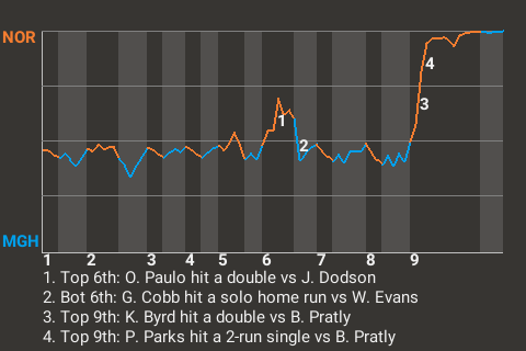 Norfolk used the timely hitting of Phil Parks to seize the win. The third baseman stroked a 2-run single in the top of the ninth inning to put the Pajaritos on top, 3-1. It was his only hit in 4 at-bats, but it was a game-changer.