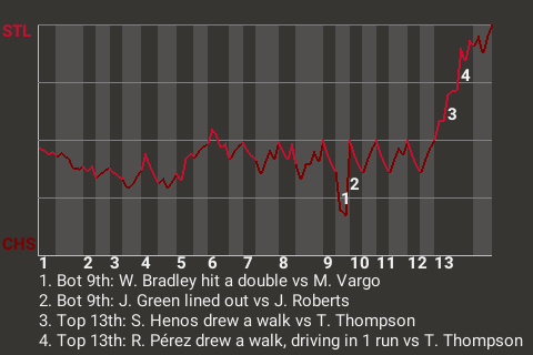 Ricardo Pérez, who is tied for 7th in the 3L in stolen bases with 7, had a direct impact on the outcome. Pérez contributed a run-scoring walk in the top of the 13th inning to put St. Louis up, 2-1.