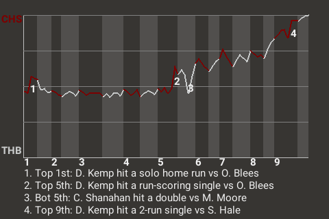 With the game tied, 1-1, in the top of the fifth, Kemp had a key at-bat for Charleston. With runners on 1st and 2nd, Kemp hit a run-scoring single off Olaf Blees, making the score 2-1, Battery.