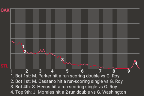 The Coeur had to work out of trouble in the top of the ninth. The score was 5-3, St. Louis, with one out. Oakland, with a runner on 2nd, was mounting a threat. José Eiriz dug in at the plate, but on a 2-2 curveball, he struck out.