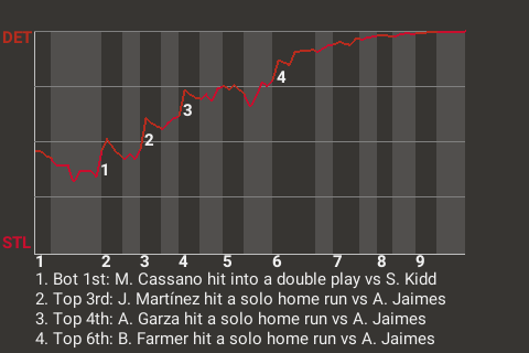 Juan Martínez impressed in the 6-0 Detroit win over St. Louis. Martínez went 3 for 3 with 2 home runs and a walk, while scoring 3 runs and driving in 2. Steve Kidd was the winner. Over 8.1 innings, he yielded no runs on 4 hits, with 2 walks and 5 strikeouts. The win gives the Rock City a record of 17-32.