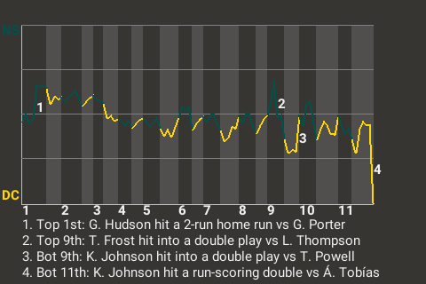 The game-ending blow was delivered by Kenny Johnson in the bottom of the 11th. That's when he hit a run-scoring double off 28-year old right-handed pitcher Álex Tobías to win it for D.C. and cause the home crowd to erupt in celebration.