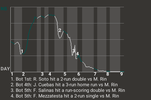 2 (10, 1st Inning off M. Rin, 1 on, 2 outs; 5th Inning off M. Rin, 2 on, 0 outs)