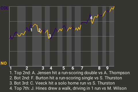 Jeff Hines, who is tied for 10th in the PL with a .487 slugging percentage, had a direct impact on the outcome. Hines contributed a run-scoring walk in the top of the seventh inning to put Colorado up, 4-2.