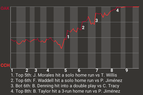 In the top of the fifth, Oakland third baseman Jorge Morales whacked a fastball to right for a solo home run. His 7th home run of the season put the Oaks in front, 1-0.