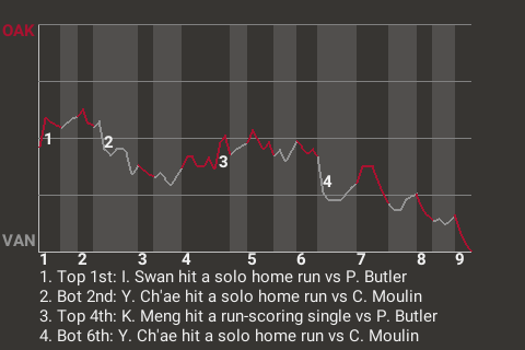 The Vancouver Grey Wolves beat the Oakland Oaks, 3-2, at Wolf Den in Vancouver. Vancouver designated hitter Yoon-tae Ch'ae had an outstanding performance. He went 3 for 4 with 2 home runs and a double. Vancouver reliever Waweru Kamili picked up the win, upping his record to 4-2. Claude Moulin took the loss. Brad Carter closed it out for Vancouver, earning his 20th save.