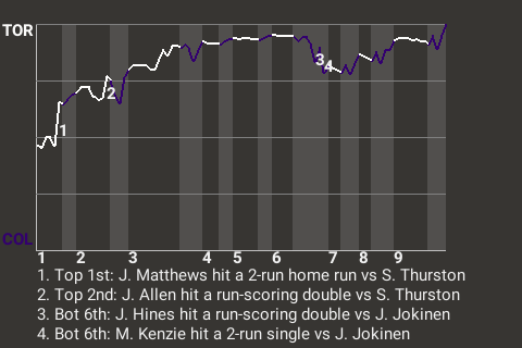 In the first inning, Matthews had a 2-run home run for Toronto. It was his 13th home run of the season and put the Thunder on top, 2-0.