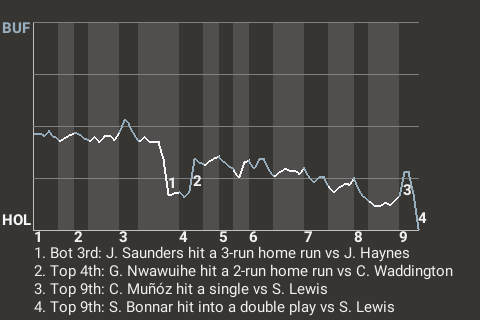 In the bottom of the third inning, left fielder Joe Saunders had a 3-run home run for Hollywood. It was his 6th home run of the season and put the Shredders on top, 3-0.