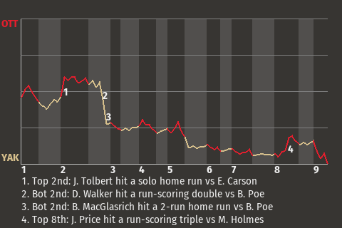 Yakima took a 2-1 lead on Peyton Nelson's 12th double of the season. The run-scoring double, which Nelson hit in the bottom of the eighth, left Tacoma pitcher Pablo De Los Santos visibly frustrated.