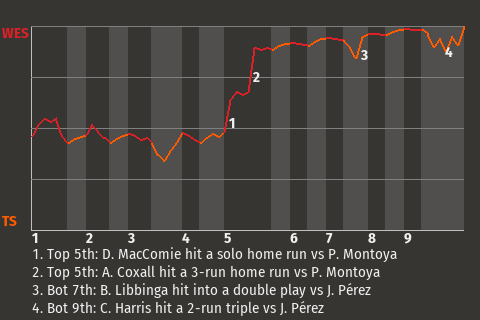 It could have been a different outcome for Westwood, had it not been for Hawk Tuahsson, the 23-year old second baseman . Tuahsson contributed a 2-run home run in the top of the fifth inning to put Westwood up, 4-1.
