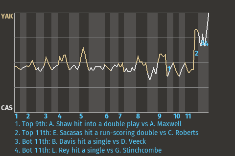 Ballpark: Loony Bin Weather: Clear skies (65 degrees), wind blowing in from center at 6 mph Start Time: 7:05 PM CT Time: 2:51 Attendance: 13702 Special Notes: RP José García was injured while pitching. |