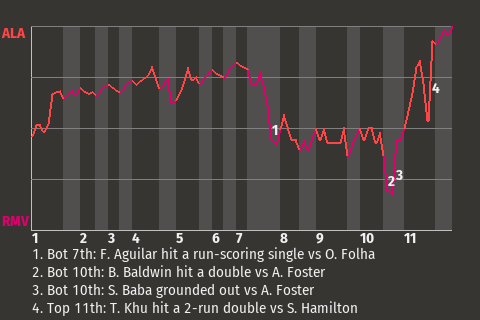 Rocky Mountain took the lead in the bottom of the sixth. With two out and a runner on 2nd, Kernie LeBlanc stroked a run-scoring single to make it 2-1, Vibes.
