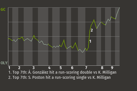 2 (4, 3rd Inning off A. Vélez, 1 on, 1 out; 7th Inning off E. Cuellar, 1 on, 2 outs)