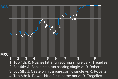 In the top of the sixth, the Patriots grabbed the lead when Powell hit his 7th home run of the season. The 2-run home run off Rhys Tregelles made it 4-2, Boston.