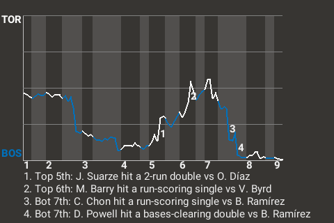 With Boston leading 6-5 in the bottom of the seventh, Powell came up to bat against Toronto pitcher Bill Ramírez. Powell hit a cutter to center for a bases-clearing double. His 11th double of the season put the Patriots on top, 9-5.