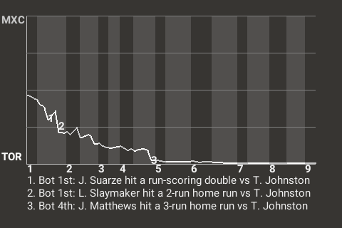 With Toronto leading 4-0 in the bottom of the fourth, Matthews came up to bat against Mexico City pitcher Tom Johnston. Matthews hit a cutter to left-center for a 3-run home run. His 12th home run of the season put the Thunder on top, 7-0.