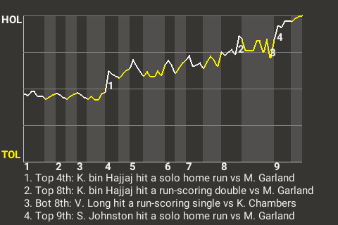 Hollywood designated hitter Kharouf bin Hajjaj delivered a run-scoring double in the top of the eighth. Overall, he went 3 for 4, picking up 1 home run, 1 single, and 1 double. He scored 1 run and knocked in 2.