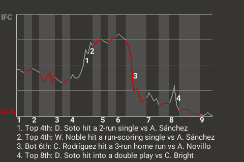 2 (2, 1st Inning off J. Bojórquez, 0 on, 2 outs; 7th Inning off S. Hall, 0 on, 1 out)