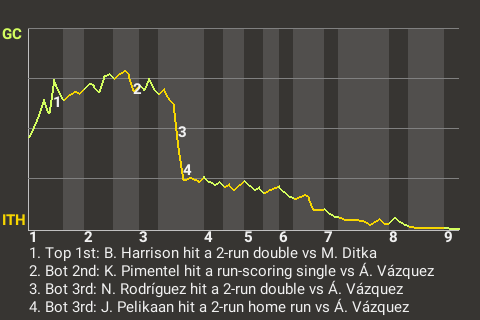 2 (17, 3rd Inning off Á. Vázquez, 0 on, 1 out; 4th Inning off Á. Vázquez, 0 on, 1 out)