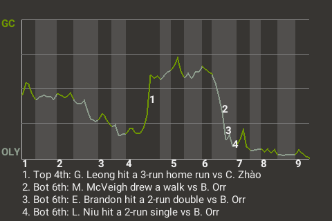 Olympia took a 5-4 lead on Brandon's 7th double of the season. The 2-run double, which he hit off Bubba Orr in the bottom of the sixth, propelled Olympia to the win.