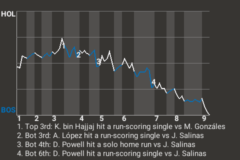 With the game tied, 2-2, in the bottom of the sixth, Powell had a key at-bat for Boston. With runners on 1st and 2nd, Powell hit a run-scoring single off José Salinas, making the score 3-2, Patriots.