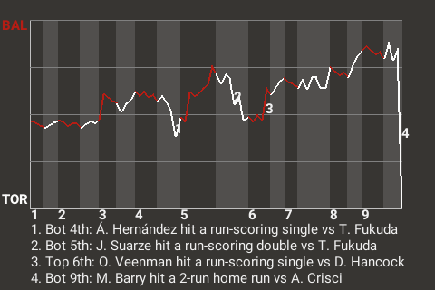 Michael Barry played the role of hero for Toronto. In the bottom of the ninth, he launched a 2-run home run off Alfonso Crisci to win the game. It was his only hit in 4 at-bats, but it was the decisive blow.