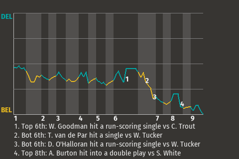 Delmarva took a 6-5 lead on Mitsunari Sakurai's 2nd double of the season. The run-scoring double, which Sakurai hit in the bottom of the eighth, left Grim pitcher Julien Parmentier visibly frustrated.