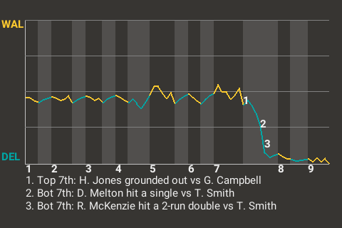 Delmarva took a 2-0 lead on Ray McKenzie's 3rd double of the season. The 2-run double, which McKenzie hit in the bottom of the seventh, left Walla Walla pitcher Tony Smith shaking his head.