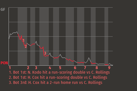 Chris Reyes had a big run-scoring double for the Caterpillars in the bottom of the second inning. With Grand Forks leading 1-0 and runners on 1st and 2nd, he got a cutter from 21-year old right-handed pitcher Noel Sharp and swatted a double to right. It was his 5th double of the season, and more importantly, it put the Caterpillars ahead, 2-0.