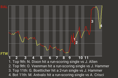 2 (4, 2nd Inning off L. Wallace, 0 on, 0 outs; 11th Inning off A. Crisci, 2 on, 1 out)