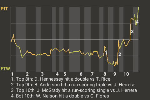 Pittsburgh used the timely hitting of John McGrady to seize the win. The first baseman stroked a run-scoring single in the top of the tenth inning to put the Kingfishers on top, 3-2. It was his only hit in 1 at-bat, but it was a game-changer.