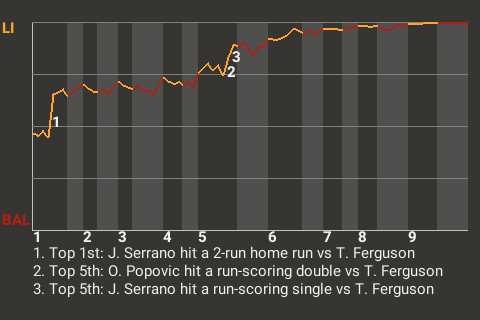 2 (6, 5th Inning off T. Ferguson, 1 on, 2 outs; 9th Inning off K. Riley, 0 on, 1 out)