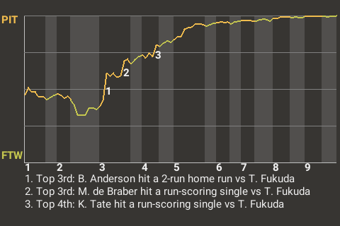 Brian Anderson cracked a home run off Teika Fukuda in the top of the third. His 2-run blast put the Kingfishers on top, 2-1. In all, Anderson had 1 single in addition to the home run, while going 2 for 6.